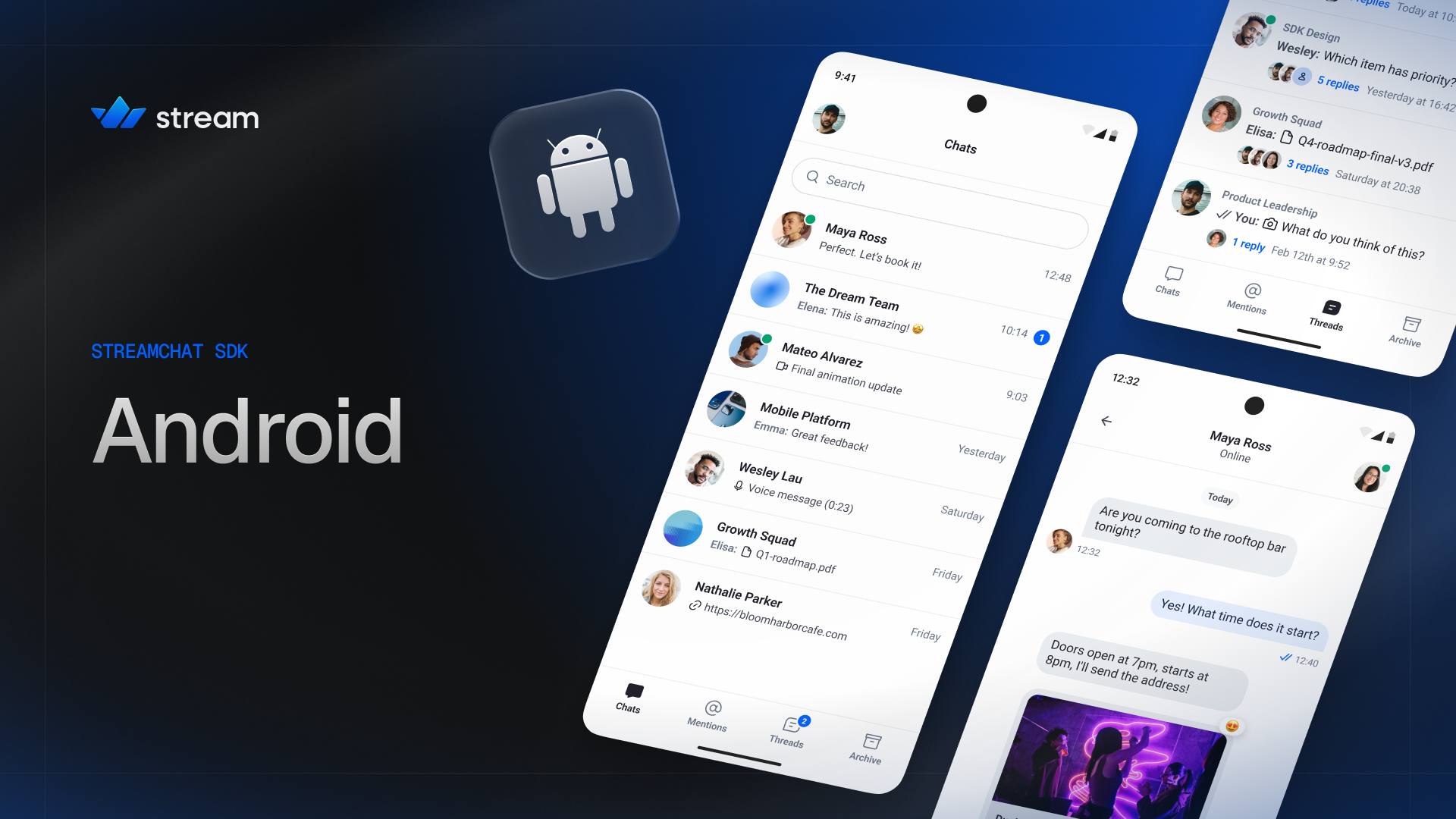 - UI Components: Reusable and customizable chat Views for displaying conversations, lists of channels, and more!