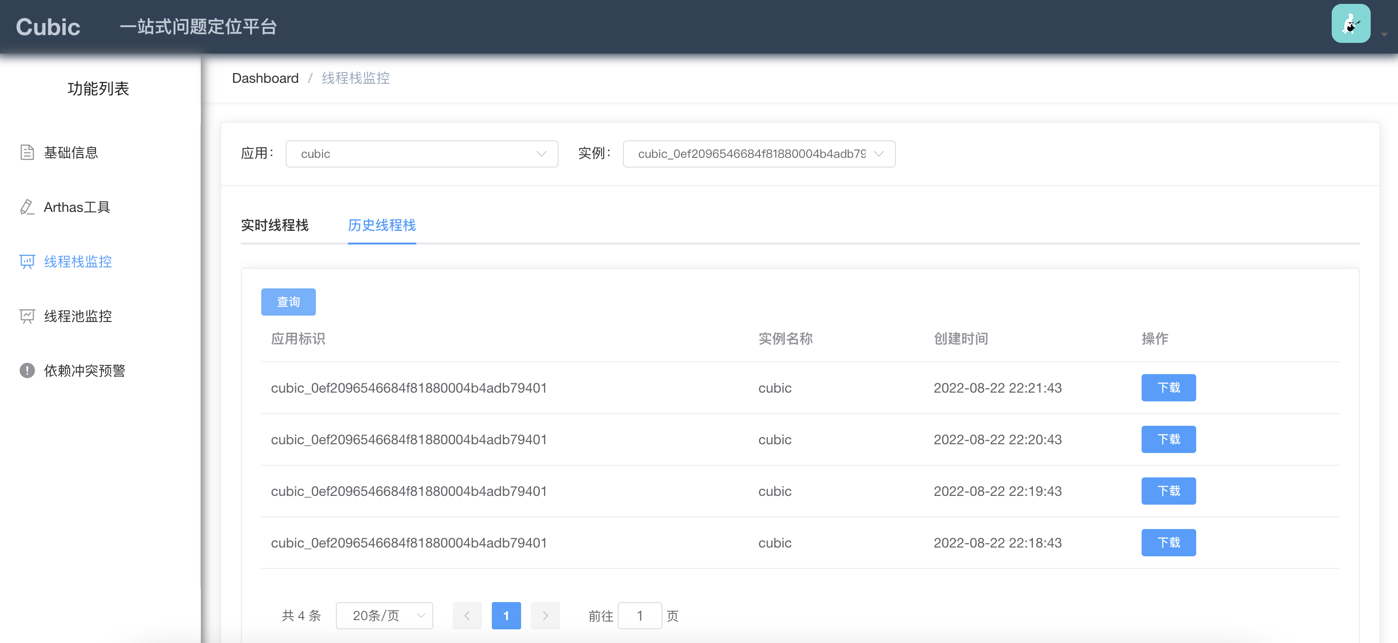 Cubic 一站式问题定位平台,以agent的方式无侵入接入应用,提供各种指标,动态线程堆栈追踪,完整集成arthas功能模块,致力于应用级监控,帮助开发人员快速定位问题。